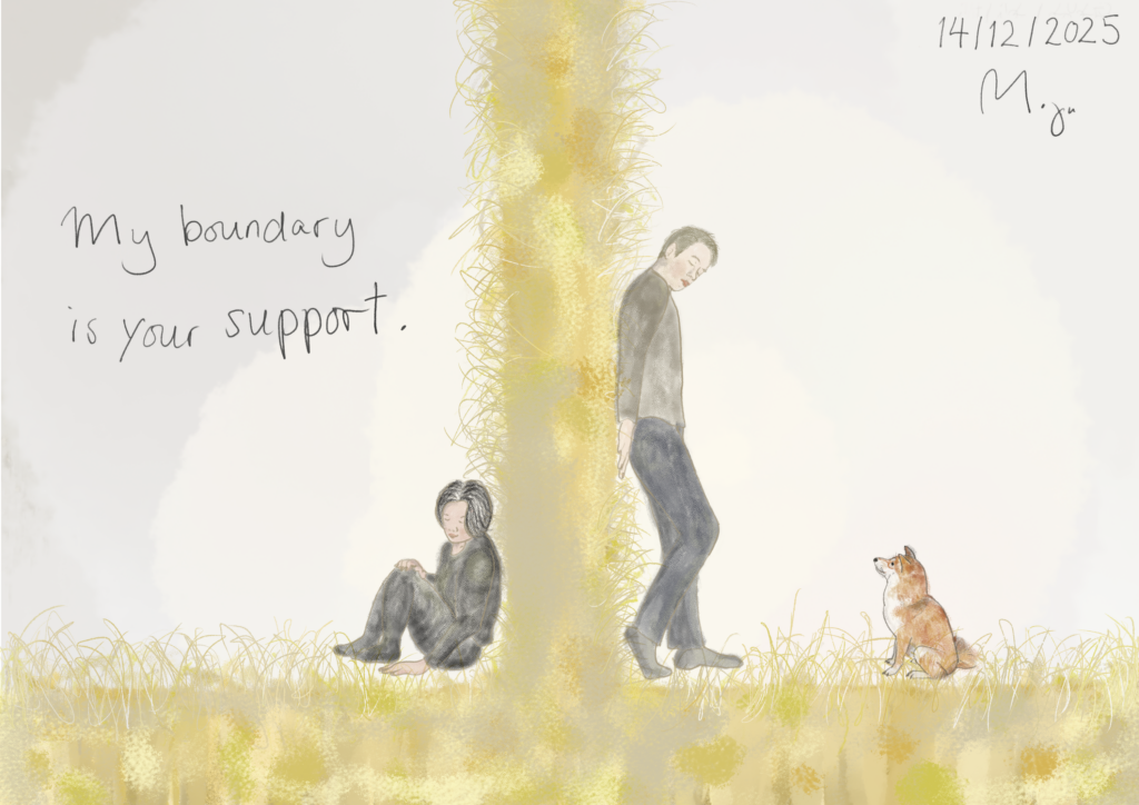 In einem Gespräch erwähnte Frau F. den Buchtitel „Meine Grenze ist dein Halt“ von Nora Imlau, der mich zu dieser Zeichnung inspirierte.