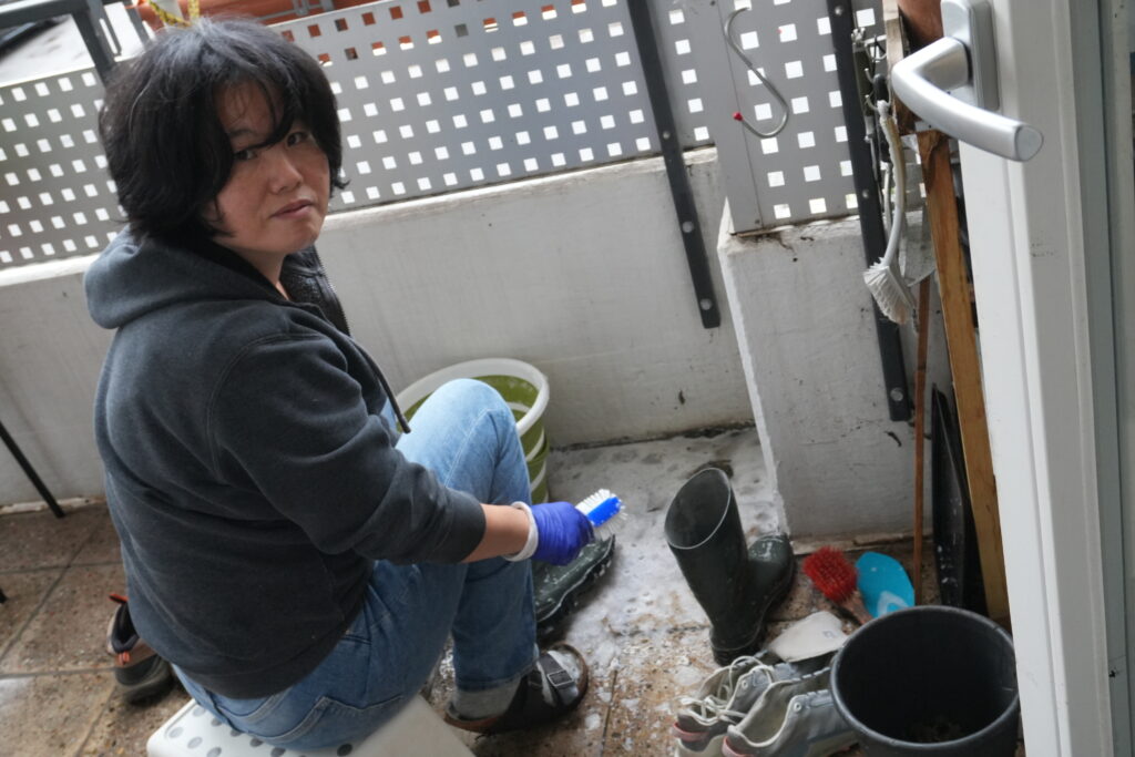 Es ist fast 40 Jahre her, dass ich Schuhe auf diese Weise gewaschen habe. In Japan, als ich noch zur Grundschule ging, war es eine Art Hausregel, dass wir drei Kinder unsere schmutzigen Schuhe am Wochenende draußen säuberten. Diese Regel verschwand plötzlich, als ich im Alter von zehn Jahren mit meiner Familie nach London zog. Auch später in Deutschland war das kein Thema mehr. Ich habe hier nie beobachtet, dass Menschen ihre Schuhe mit einer Bürste von Hand waschen – geschweige denn Kinder.